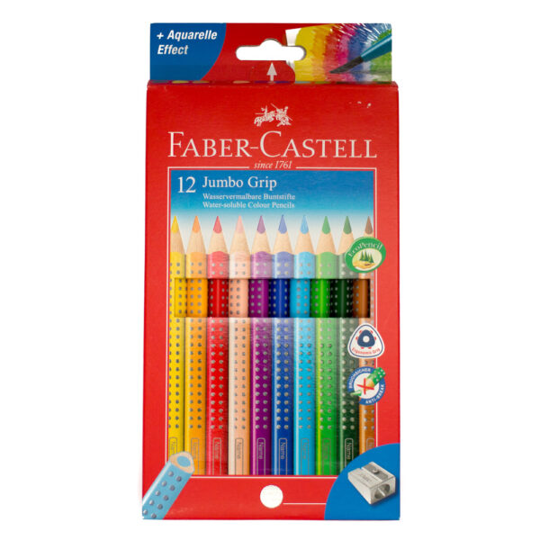 12 Jumbo GRIP Colour Pencils & Sharpener. Pack of twelve triangular, water-soluble colouring pencils with raised resin dots make for comfortable colouring and drawing. Excellent products for improving pencil grip