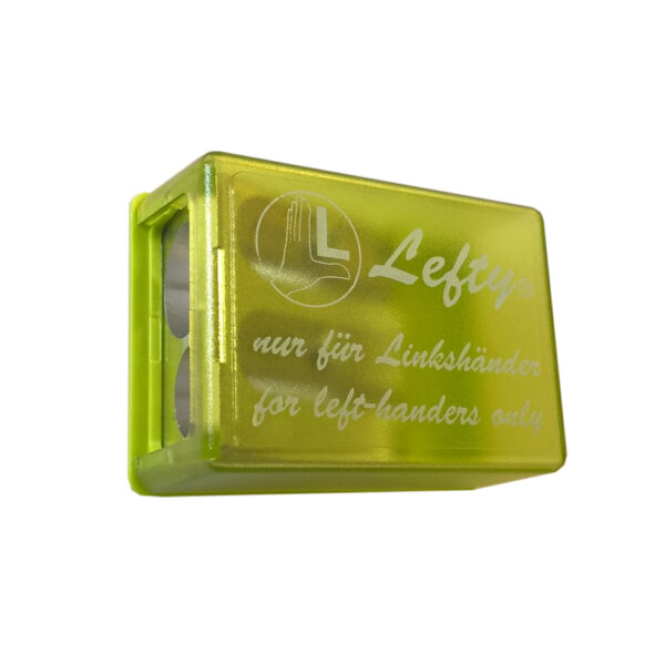 2 hole left-handed pencil sharpener which is small enough to fit in a pencil case. Hold in your right hand and turn away from you with your left.