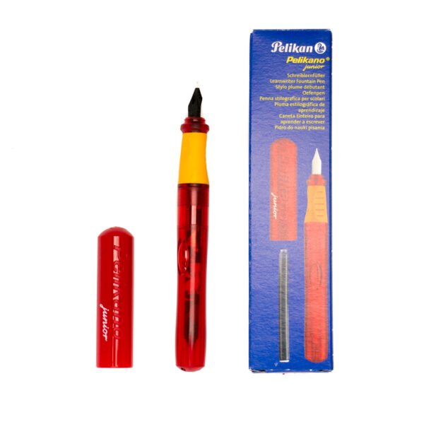Pelikano Junior - Red Left-Handed. The Pelikano Junior range is a bright sturdy version of our best-selling Pelikano, with a less delicate nib unit for younger writers, a ridge at the bottom of the grip to stop the hand sliding too far down and name tags to keep it safe. Highly recommended!
