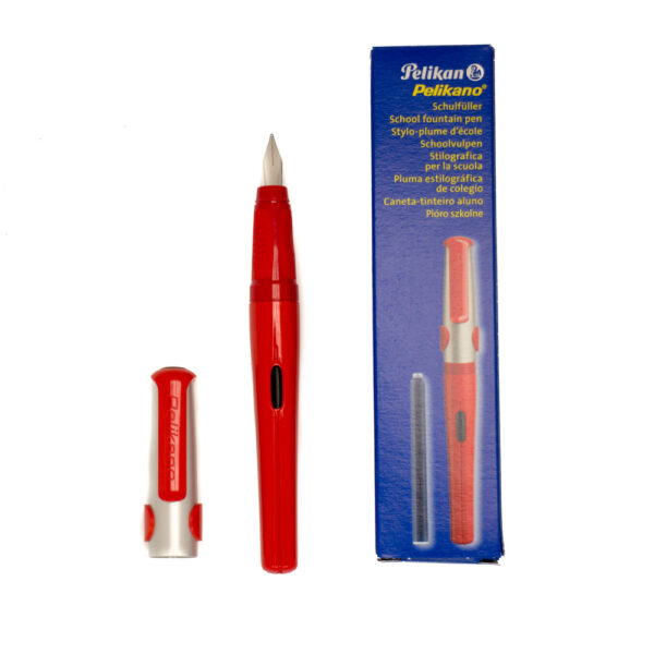 Pelikano School Pen - Red LH. This is a new version of the Pelikano Cartridge pen specifically designed for the left-hander. The Pelikano pen is the recommended pen for left handed children as it will work whatever style of writing the child has. It has a rounded nib and gives a smooth flow of ink.
