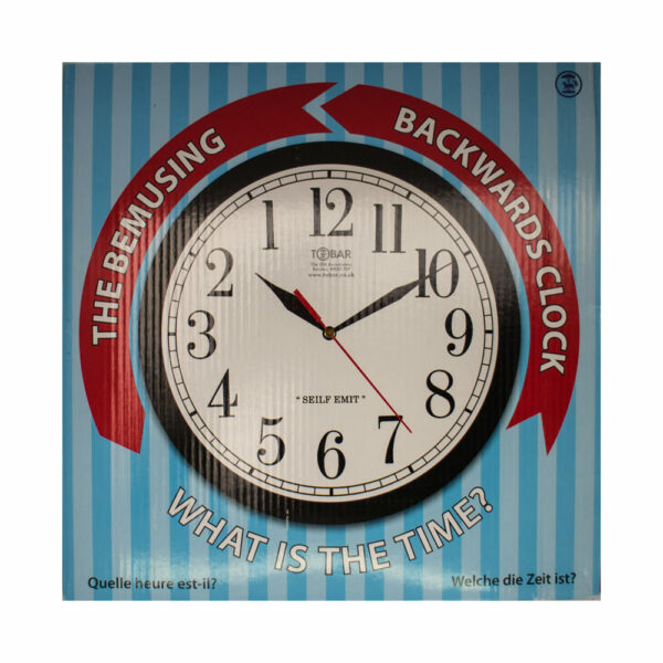 Backwards Clock. A robust, large quartz wall clock whose hands and dial go anti-clockwise!