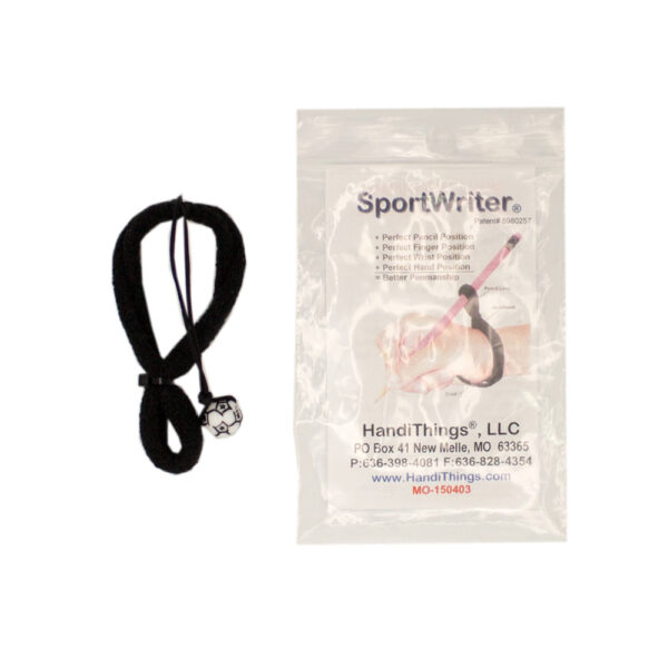 This clever device helps maintain proper position of the pencil in the hand. Simply place the loop around the wrist then grasp the pencil and place other loop around the upper end of the pencil. The child holds the tiny football between their little finger and next finger. Strange though it sounds, it closes the grip and is really effective.